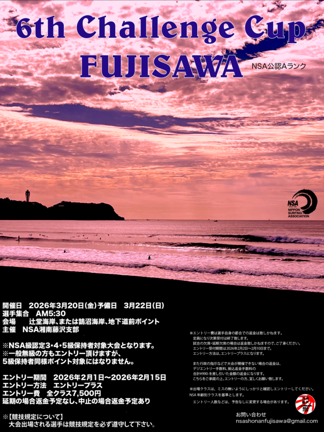 2026/01/31第6回 challenge cup 藤沢 エントリーご案内第6回 challenge cup 藤沢 開催のお知らせ、及びエントリーご案内 開催地 藤沢市 鵠沼海岸 辻堂正面 or 地下道前 開催日 2026年3月20日 予備日3月22日 選手集合 AM5:30予定 辻堂正面…