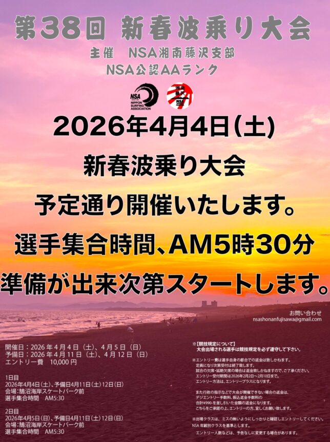 2026/03/26第38回新春波乗り大会 スケジュール第38回新春波乗り大会 スケジュールを掲載致します。 開催地 藤沢市 鵠沼海岸 スケパーポイント 開催期間 2026年4月4日(土) ~4月5日(日) 予備日2026年4月11日(土) ~4月12日(日) 選手集合 …
